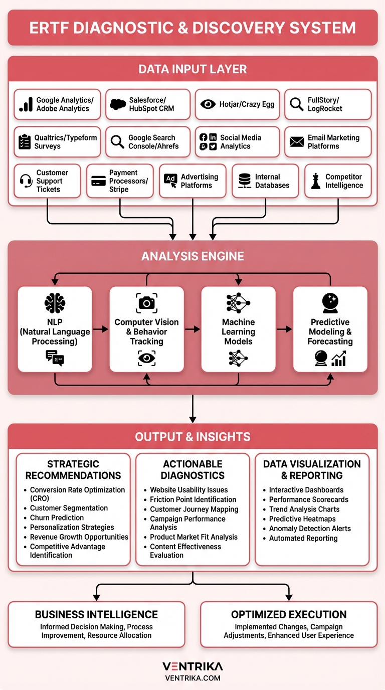 Before we optimize anything, we need to understand everything. The ERTF Diagnostic & Discovery System is the most comprehensive revenue audit you'll ever experience. We don't just look at your Google Analytics—we integrate data from 12+ sources including your CRM, advertising platforms, customer behavior tools, survey data, payment processors, support tickets, and competitive intelligence.