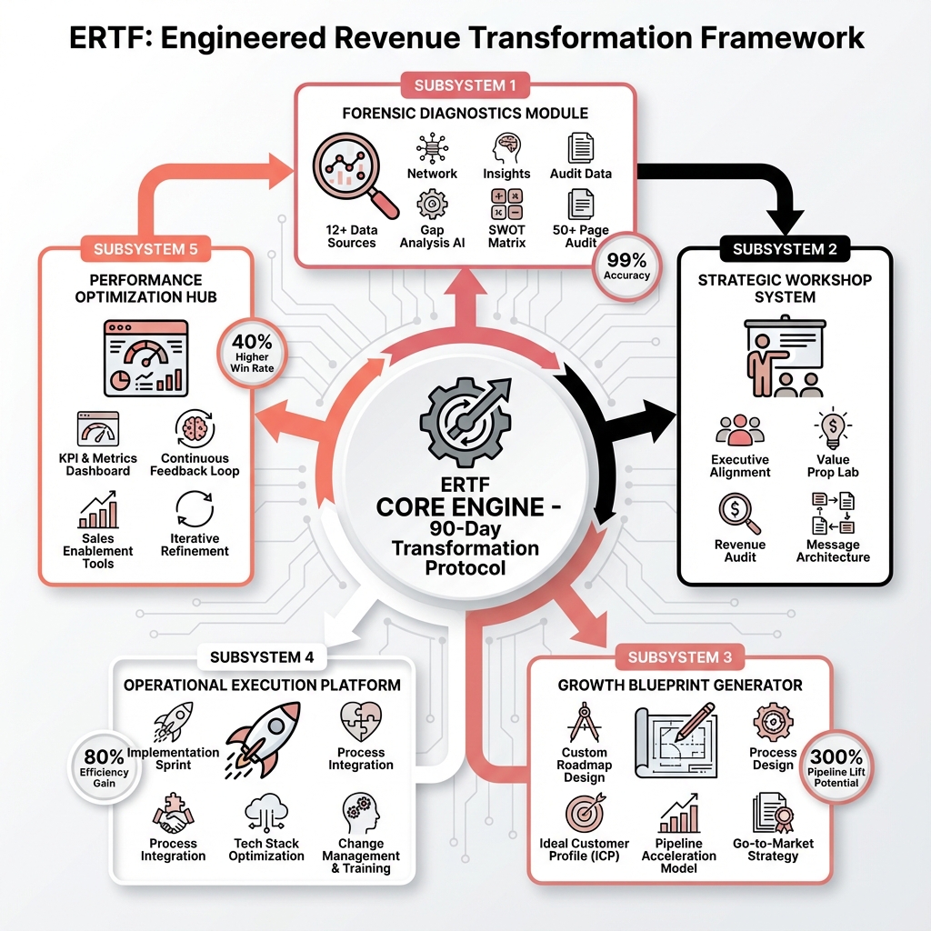 At the core of ERTF is our 90-Day Transformation Protocol, which orchestrates five critical subsystems to diagnose, architect, and optimize your entire revenue engine: