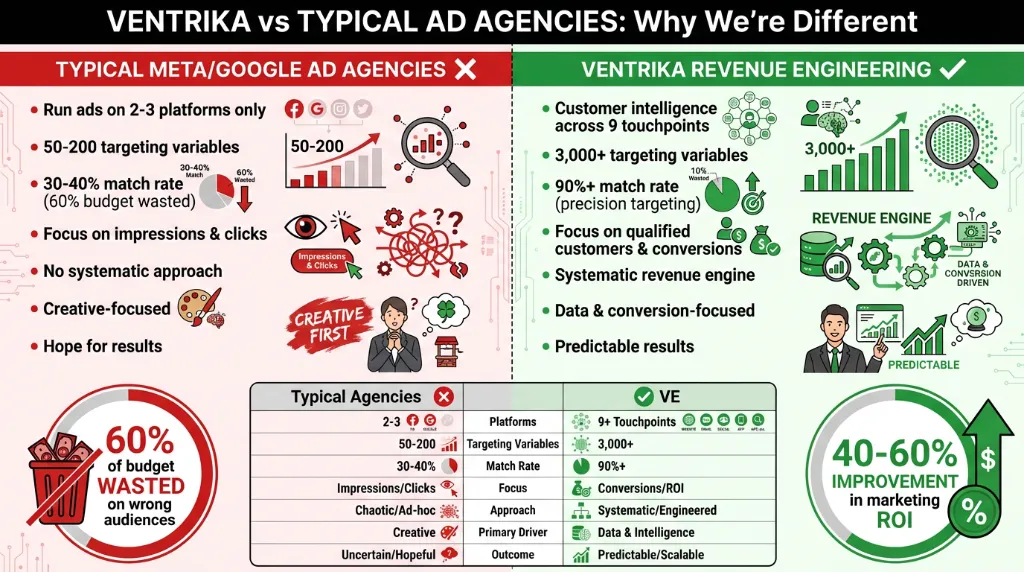 A healthcare services provider was working with a traditional agency running campaigns on Facebook and Google. Despite a $40K/month budget, their cost per qualified lead was $420 and climbing. They were generating clicks, but very few turned into actual patients. We diagnosed the issue immediately: poor targeting (only 200 variables analyzed) and no orchestration across channels. After implementing VENTRIKA's 9-touchpoint system with 3,000+ variable analysis, cost per qualified lead dropped to $145, lead quality increased dramatically (85% met their ideal patient profile), and they achieved a consistent 5:1 ROAS. The transformation came from precision engineering, not creative adjustments.